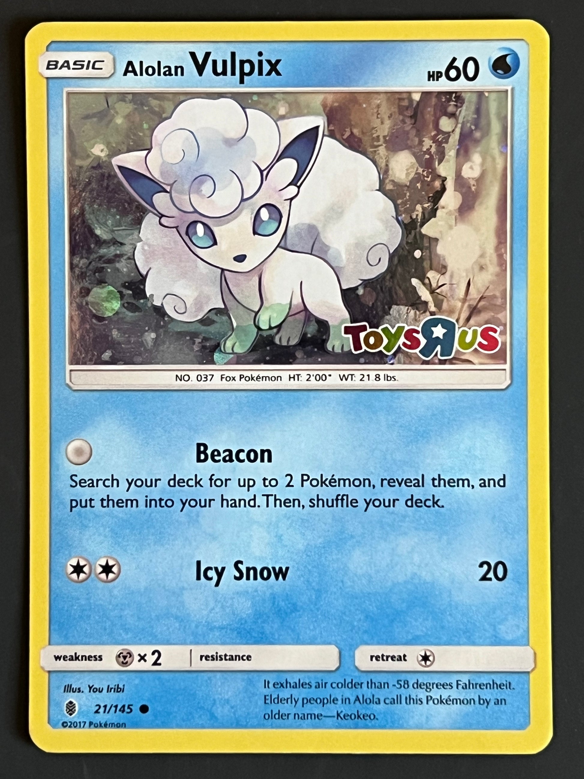021/145 Alolan Vulpix (STAMPED) - Pokémon Guardians Rising Toys ‘R’ Us Promo, near-mint condition, comes packed in a sleeve and a semi-rigid case.