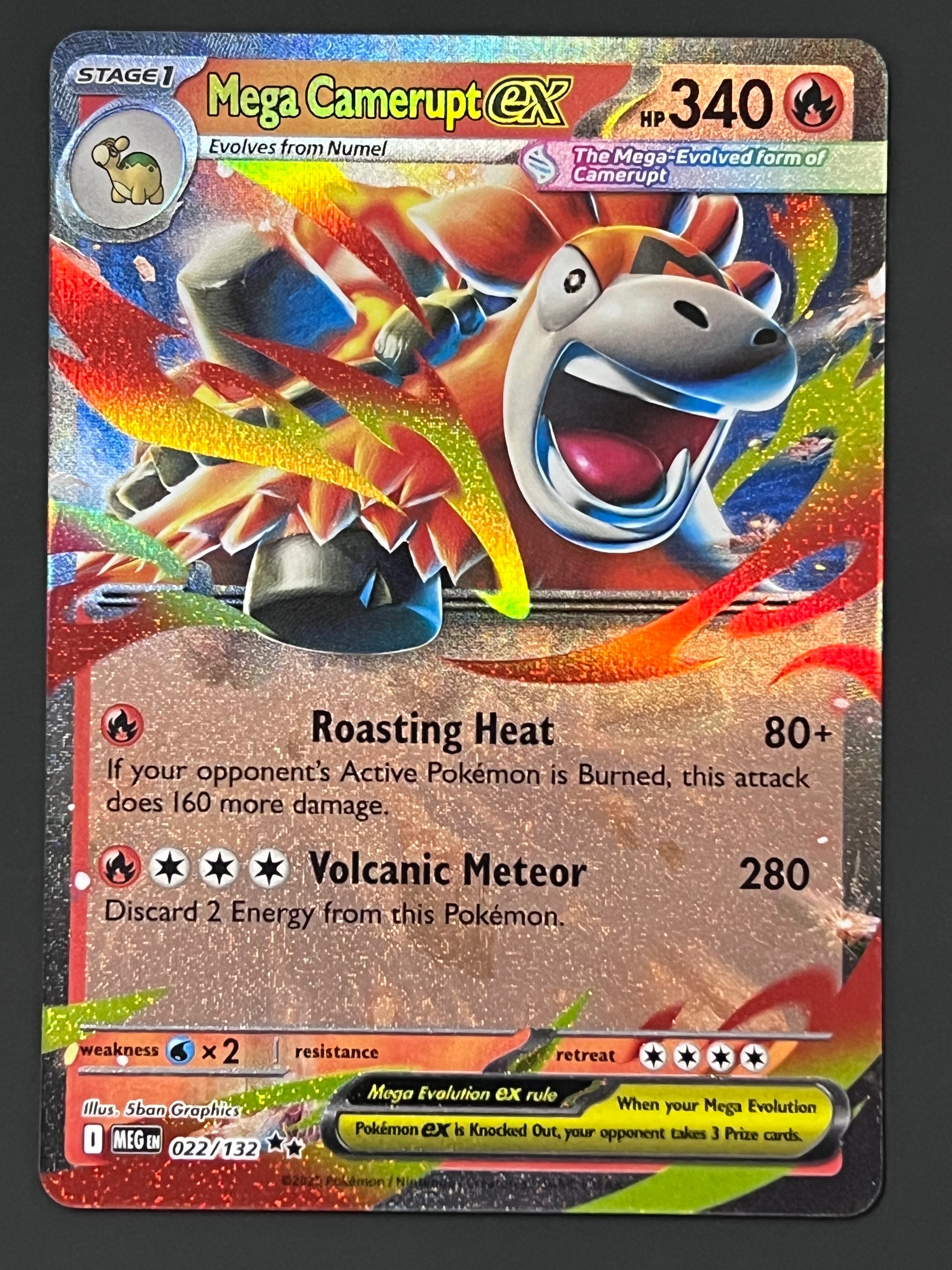 022/132 Mega Camerupt ex - Pokémon Mega Evolution Base Double Rare, near-mint condition, comes packed in a sleeve and a semi-rigid case.