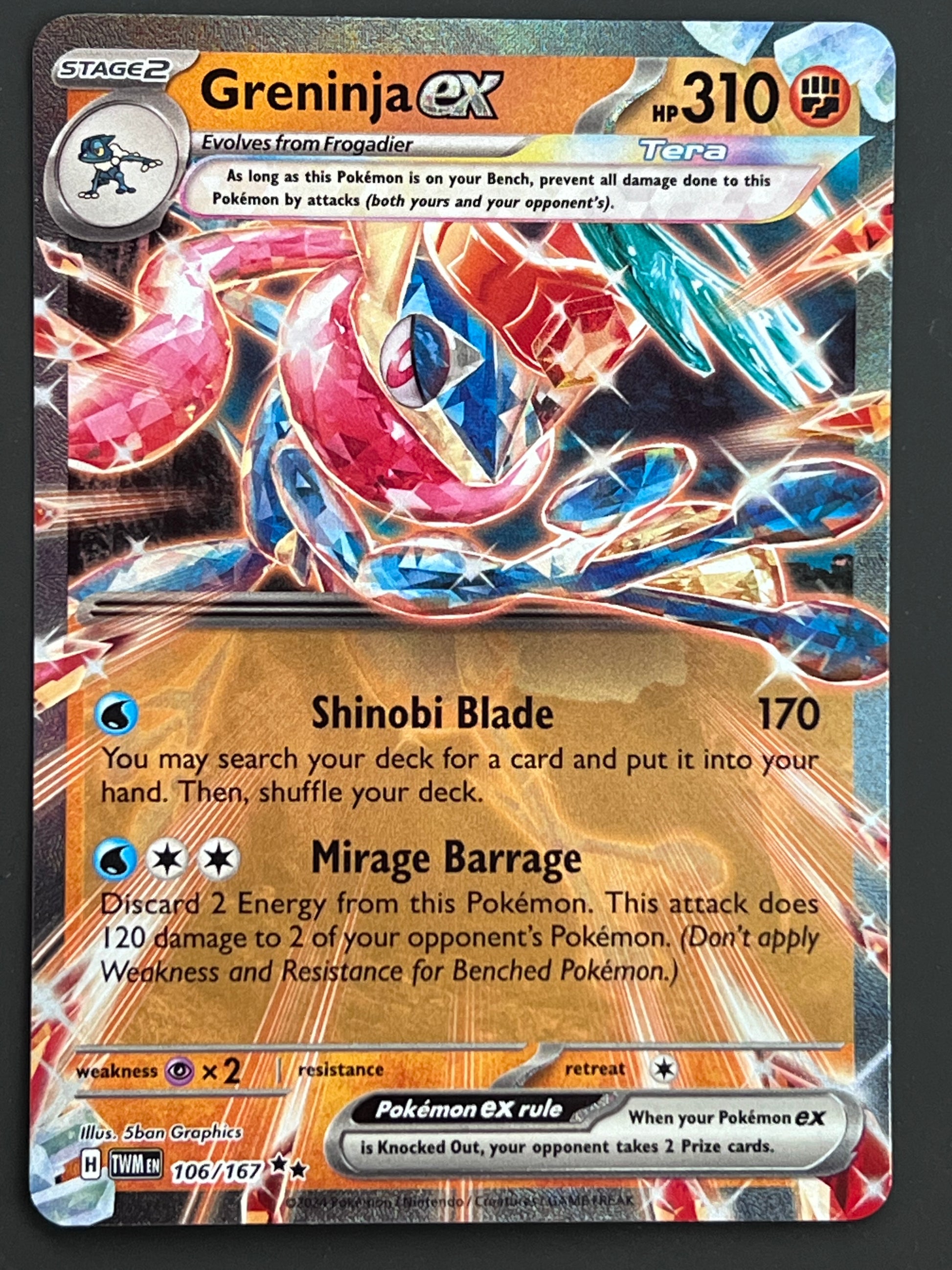 106/167 Greninja Ex - Pokémon Twilight Masquerade Double Rare, mint/near-mint condition, comes packed in a sleeve and a semi-rigid case.