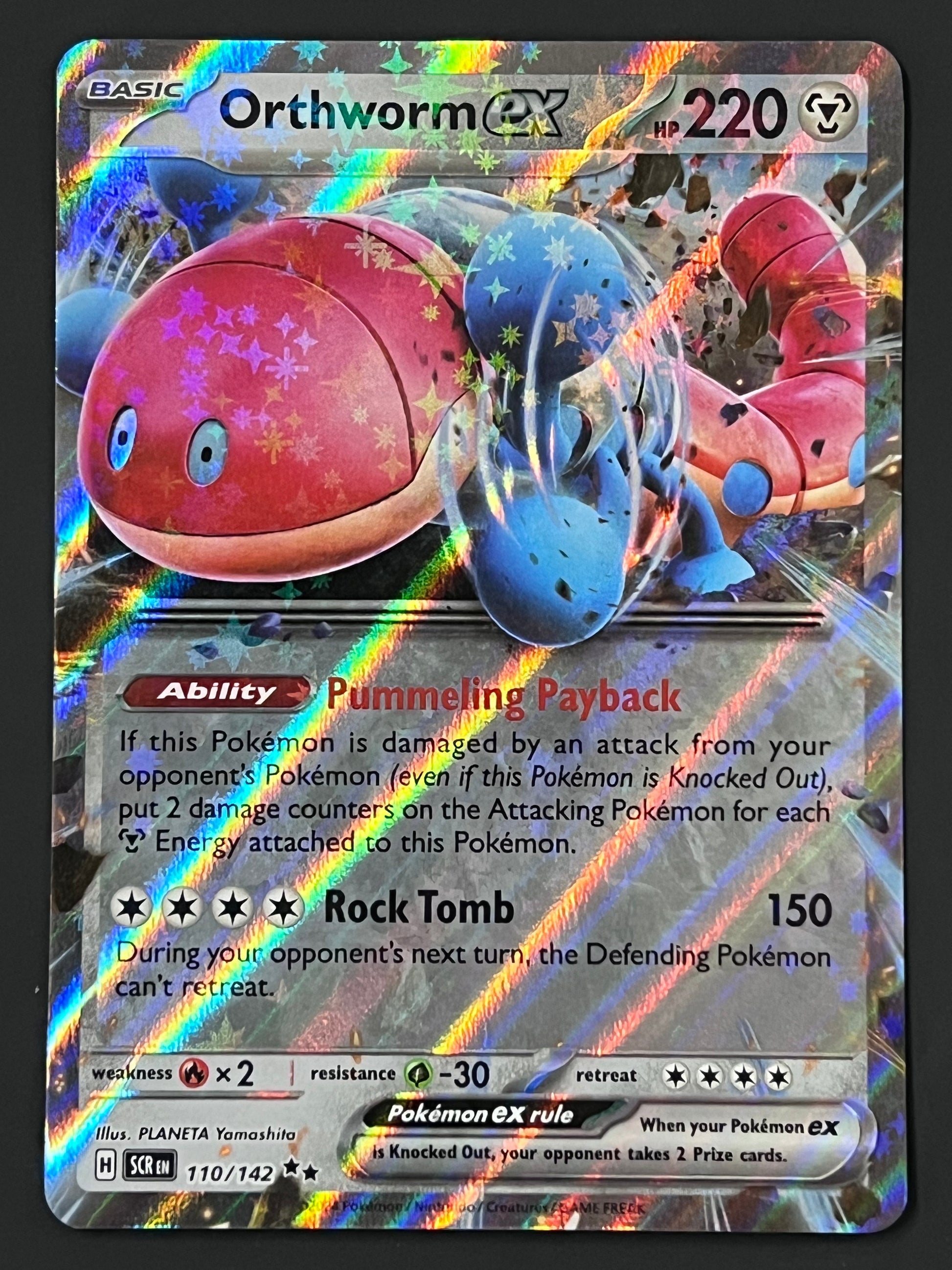 110/142 Orthworm Ex - Pokémon Stellar Crown Double Rare, mint/near-mint condition, comes packed in a sleeve and a semi-rigid case.
