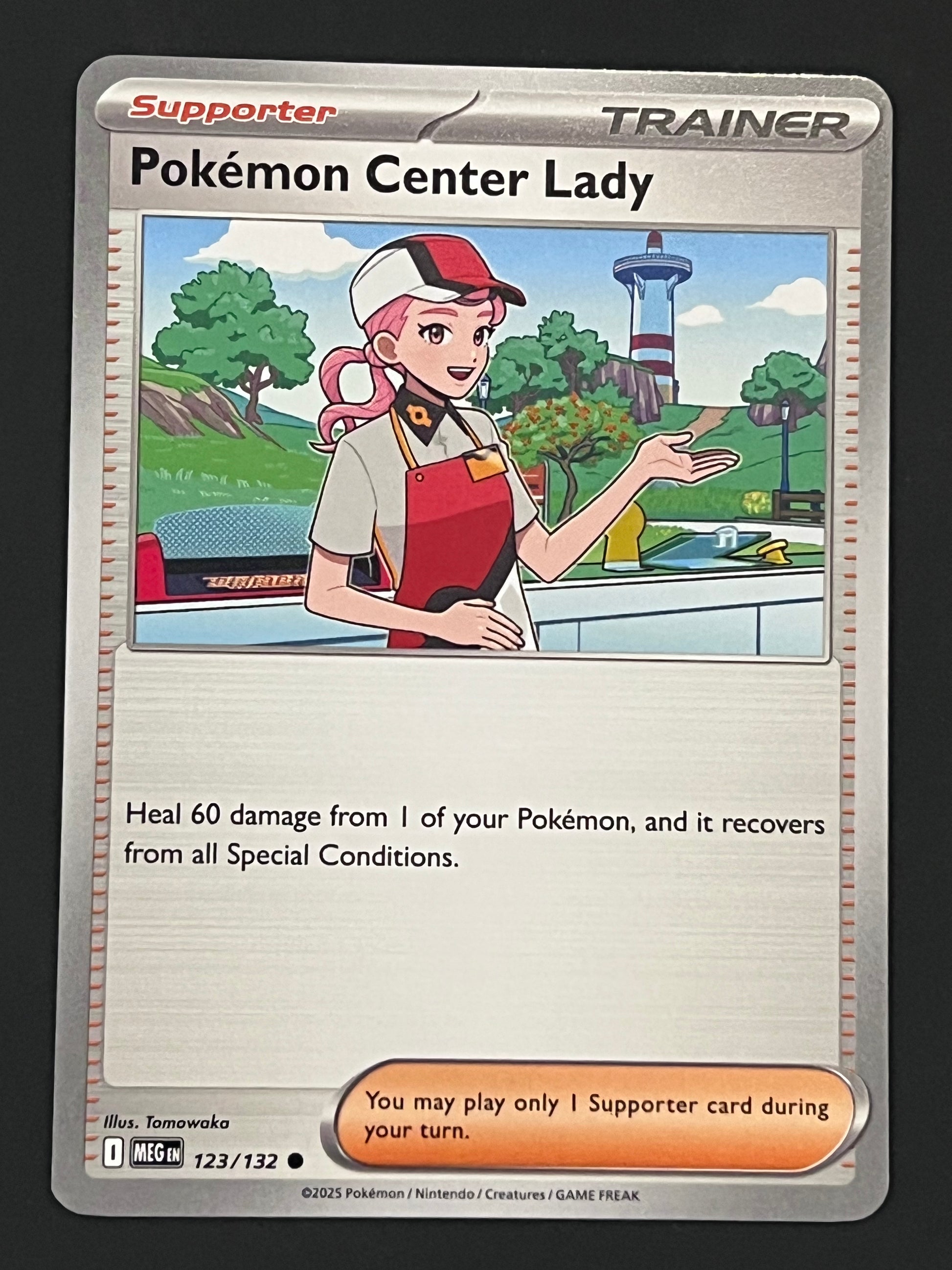123/132 Pokémon Center Lady - Pokémon Mega Evolution Base Common, near-mint condition, comes packed in a sleeve.
