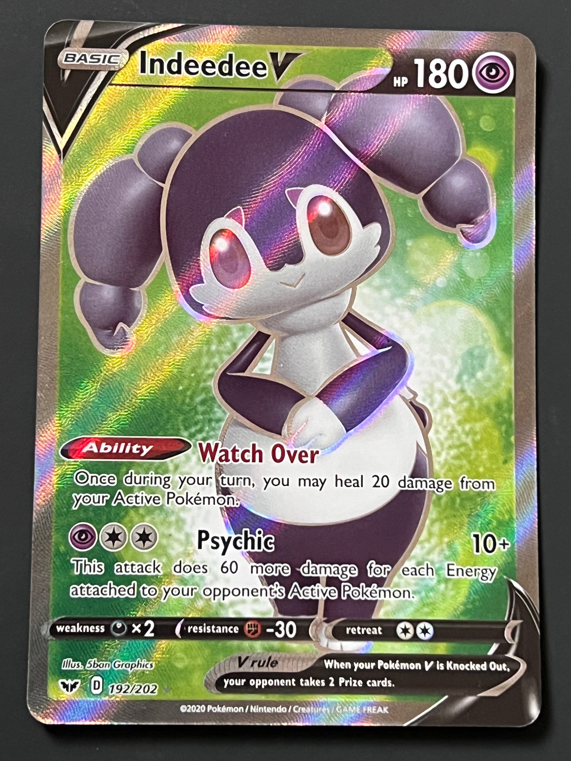 192/202 Indeedee V - Sword/Shield Base Full Art, mint/near-mint condition, comes packed in a sleeve and a semi-rigid case.