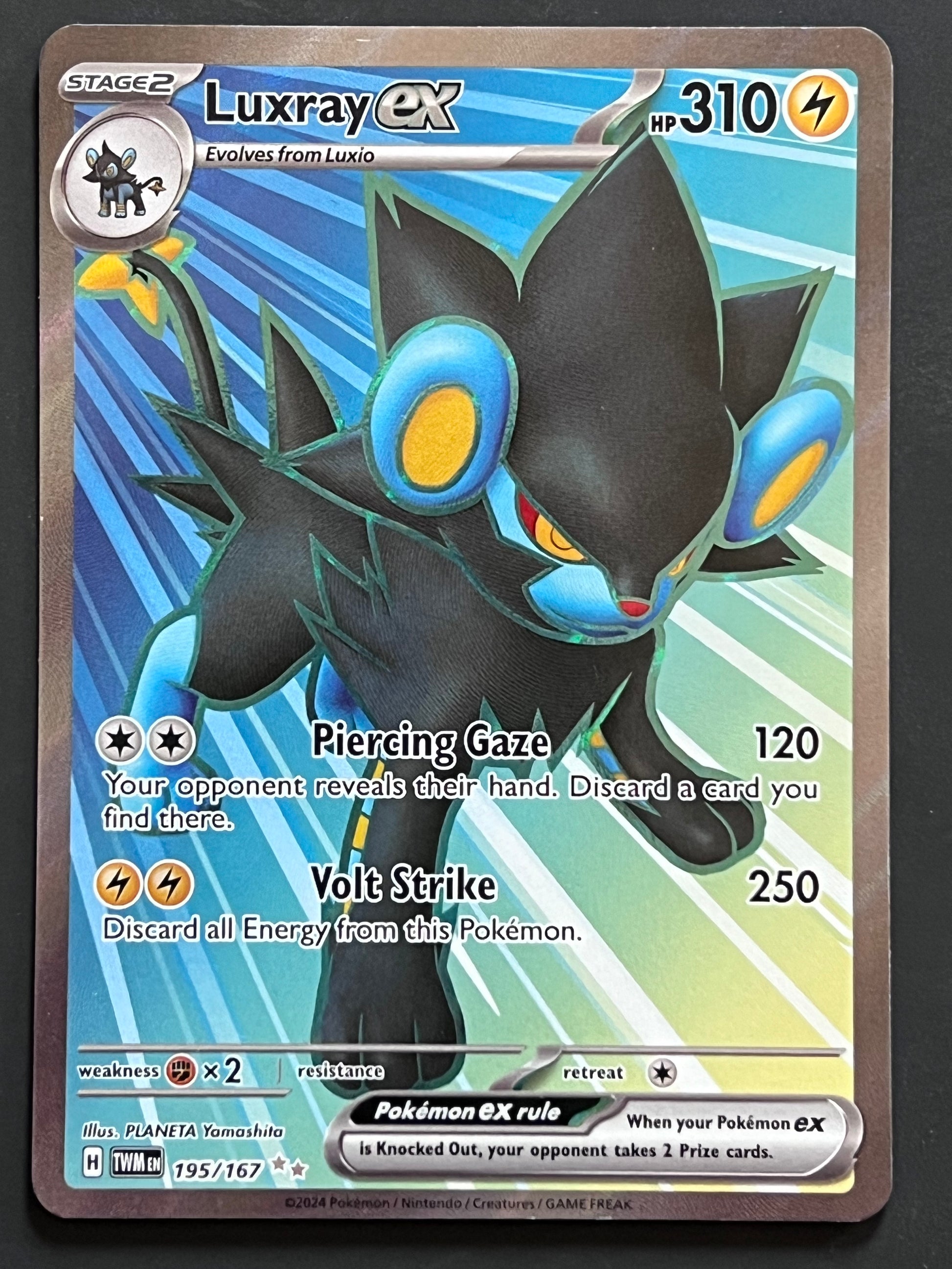 195/167 Luxray Ex - Pokémon Twilight Masquerade Ultra Rare, mint/near-mint condition, comes packed in a sleeve and a semi-rigid case.