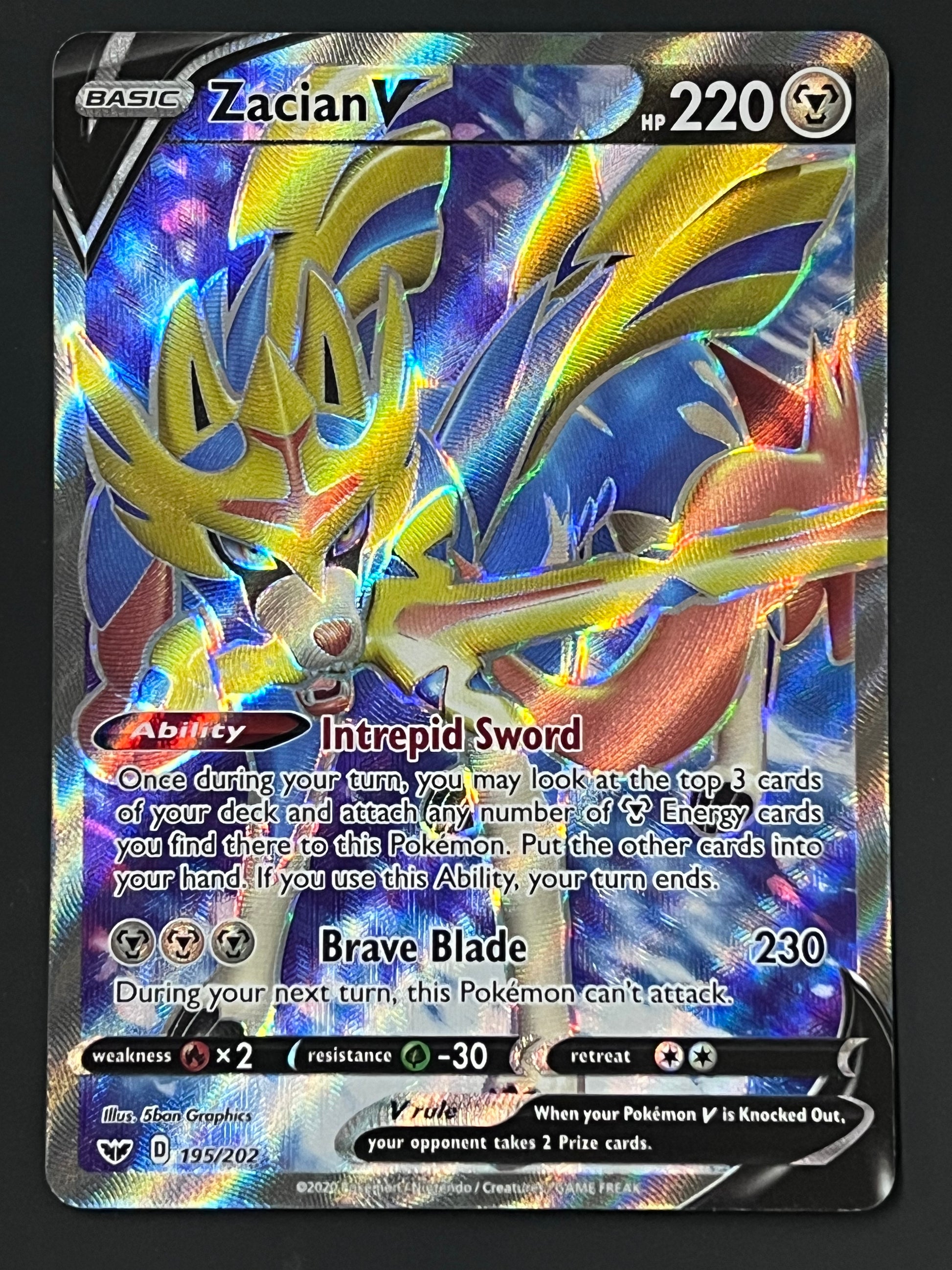 195/202 Zacian V - Sword/Shield Base Full Art, mint/near-mint condition, comes packed in a sleeve and a semi-rigid case.