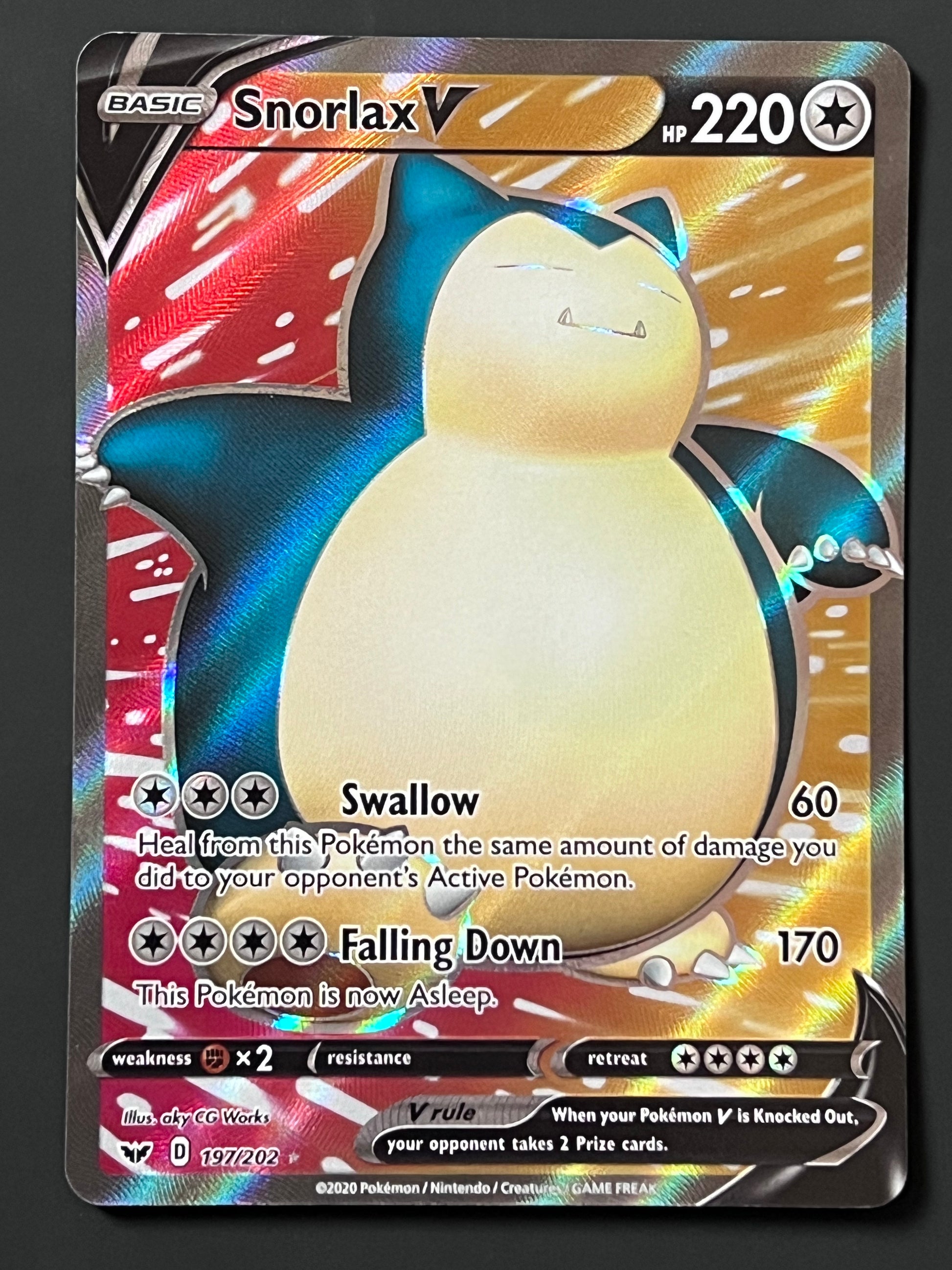 197/202 Snorlax V - Sword/Shield Base Full Art, mint/near-mint condition, comes packed in a sleeve and a semi-rigid case.