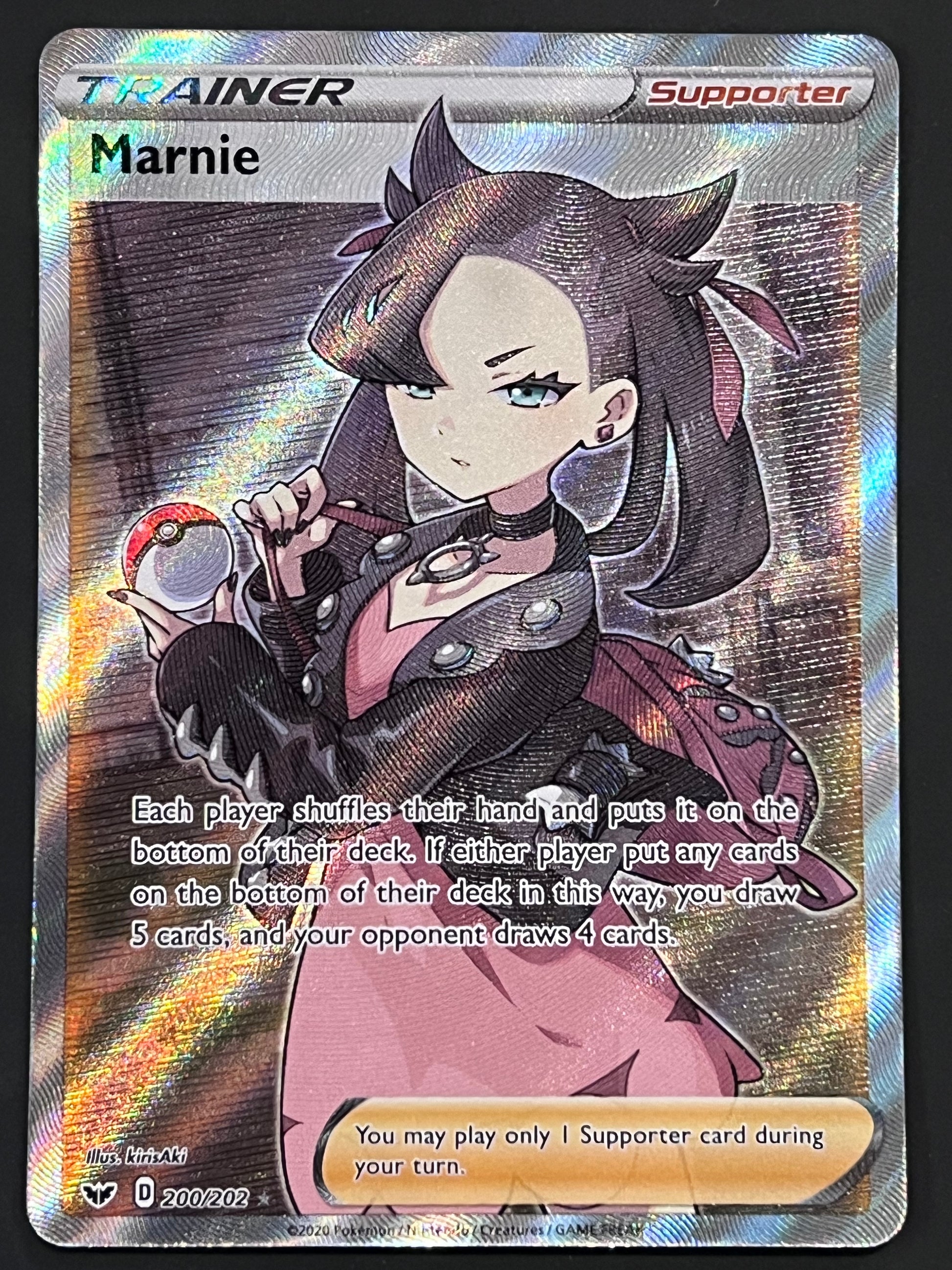 200/202 Marnie - Sword/Shield Base Full Art, mint/near-mint condition, comes packed in a sleeve and a semi-rigid case.