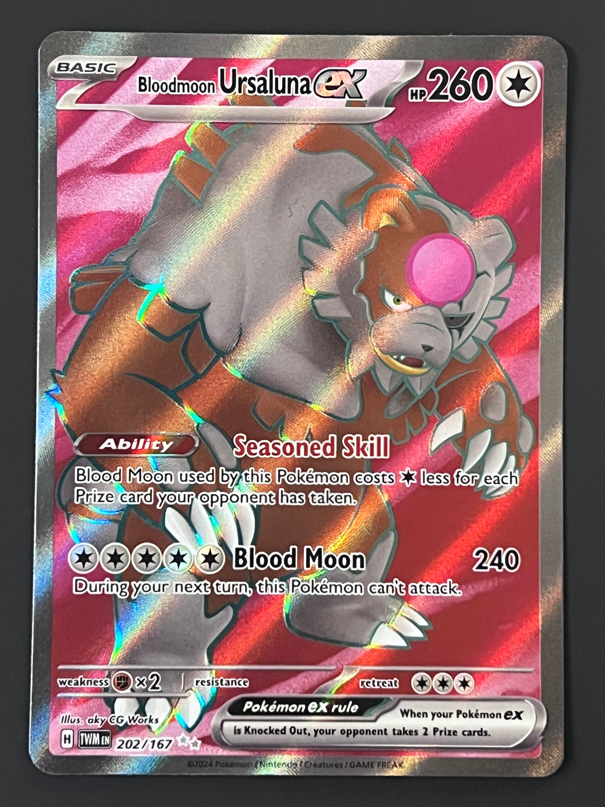 202/167 Bloodmoon Ursaluna Ex - Pokémon Twilight Masquerade Ultra Rare, mint/near-mint condition, comes packed in a sleeve and a semi-rigid case.