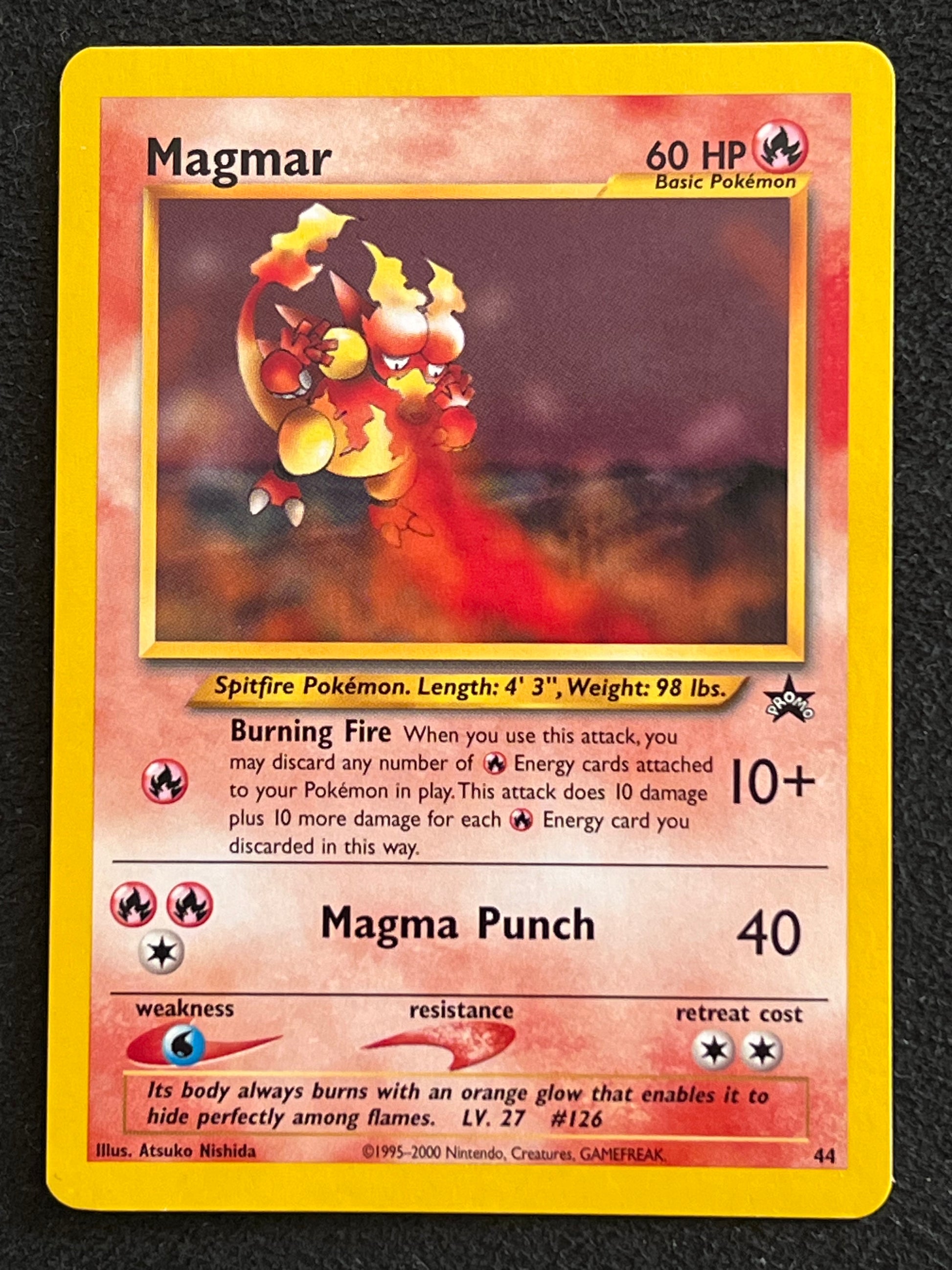 44 Magmar - WoTC Black Star Promo, near-mint/excellent condition (may show some signs of whitening to the back, front near/mint) comes packed in a sleeve and a semi-rigid case.