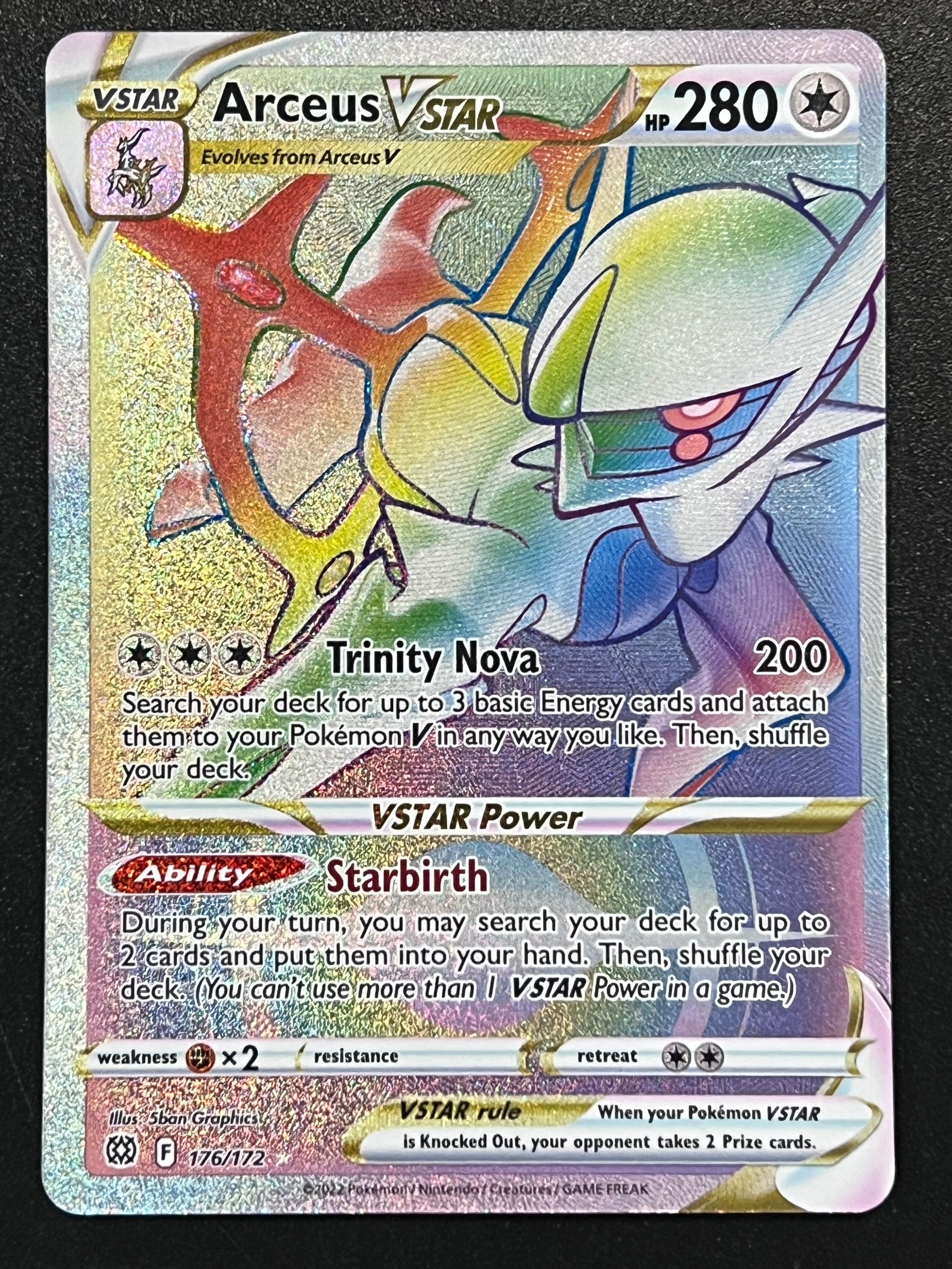 176/172 Arceus VStar - Brilliant Stars Rainbow Secret Rare, mint/near-mint condition, comes packed in a sleeve and a semi-rigid case.