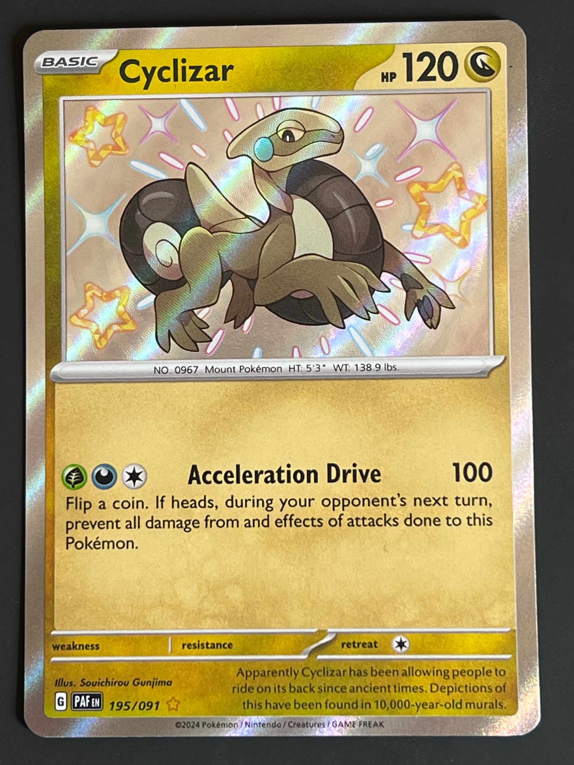 195/091 Cyclizar - Pokémon Paldean Fates Shiny Rare, mint/near-mint condition, comes packed in a sleeve and a semi-rigid case.