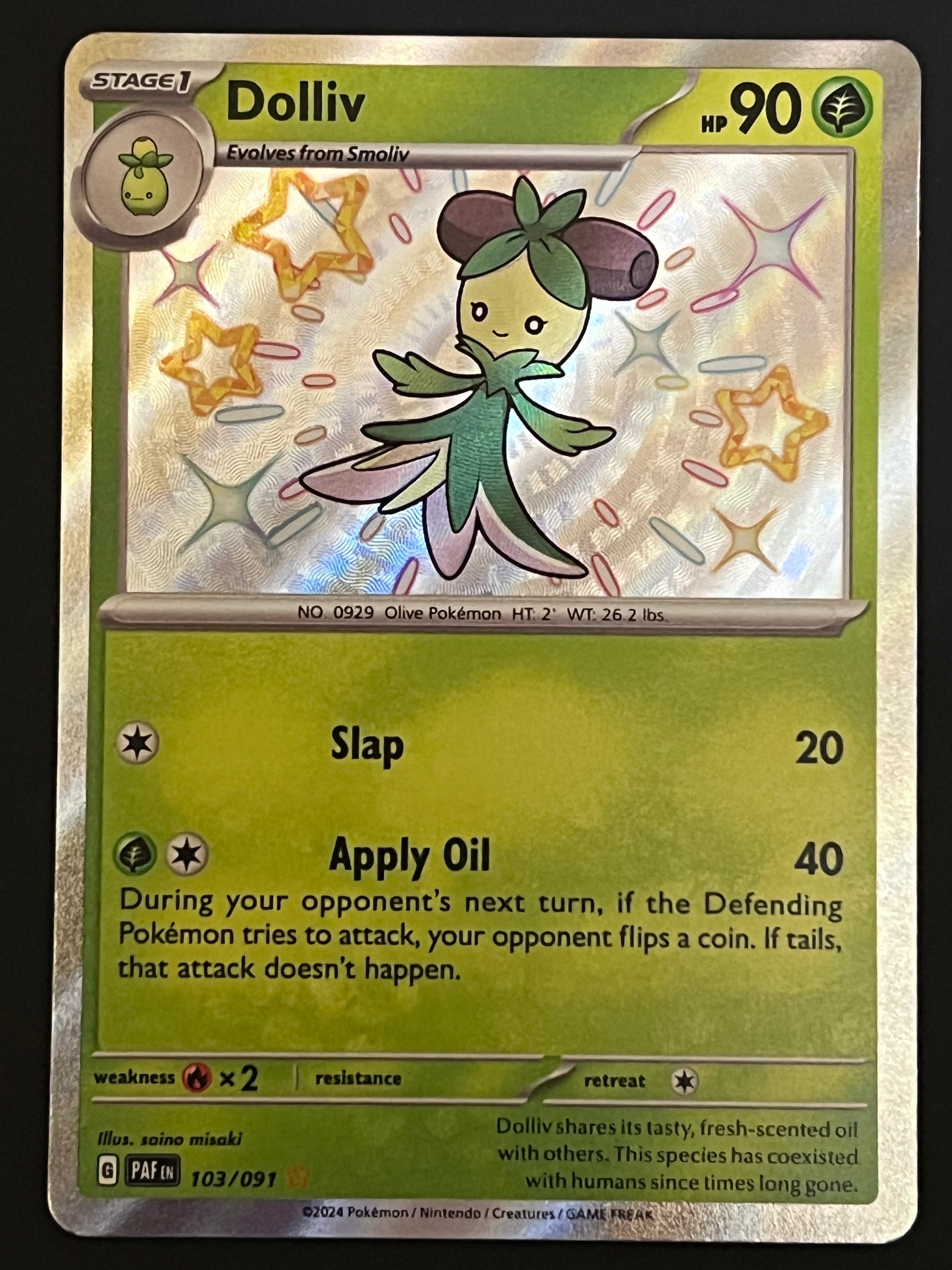 103/091 Dolliv - Pokémon Paldean Fates Shiny Rare, mint/near-mint condition, comes packed in a sleeve and a semi-rigid case.