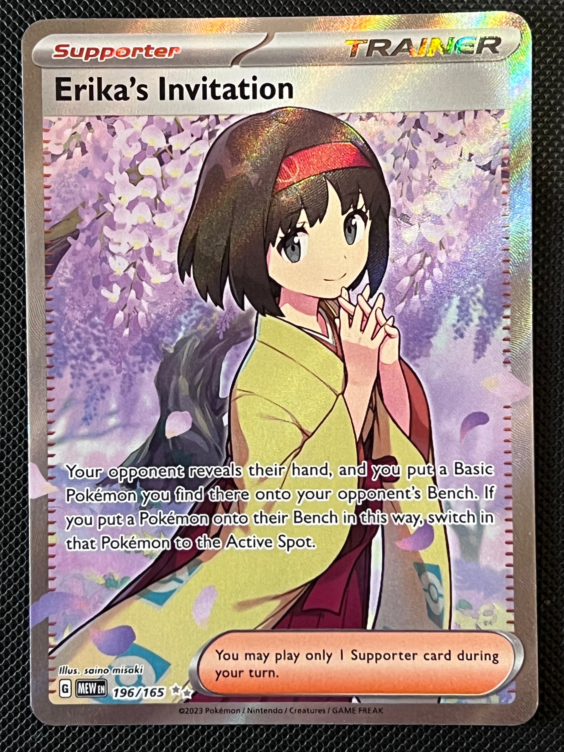 196/165 Erika’s Invitation - Pokémon 151 Ultra Rare, mint/near-mint condition, comes packed in a sleeve and a semi-rigid case.