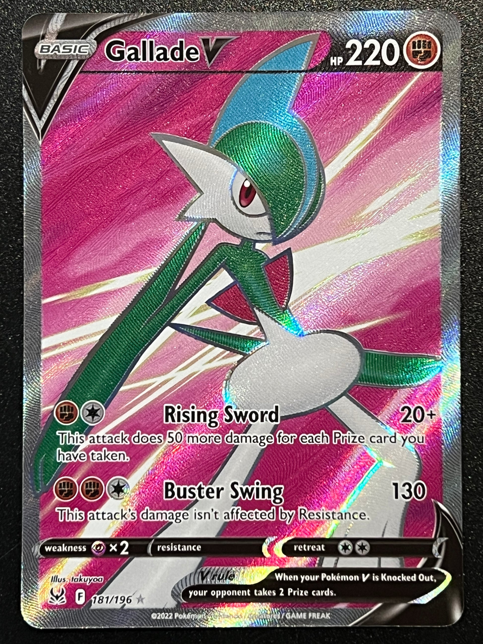 Gallade V - 181/196 Lost Origin Rare Holo V Full Art, mint/near-mint condition, comes packed in a sleeve and a semi-rigid case.