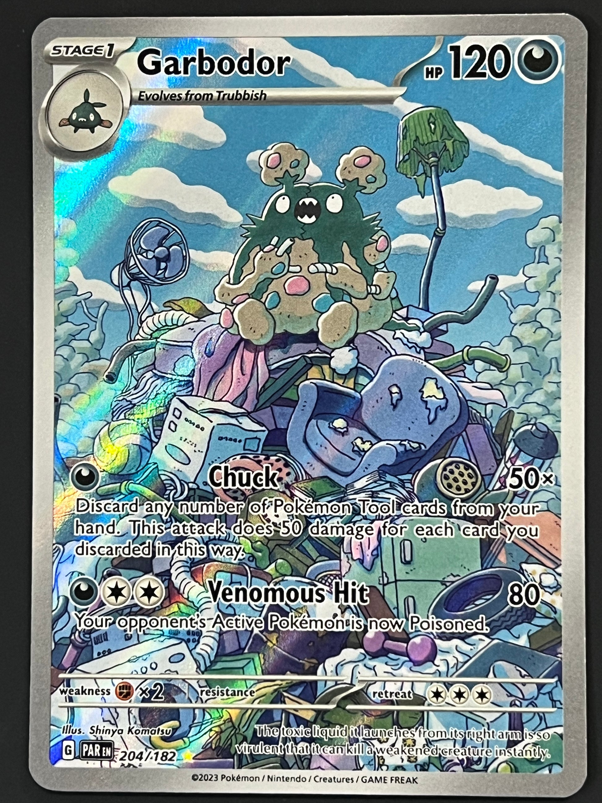204/182 Garbodor - Pokémon Paradox Rift Illustration Rare, mint/near-mint condition, comes packed in a sleeve and a semi-rigid case.