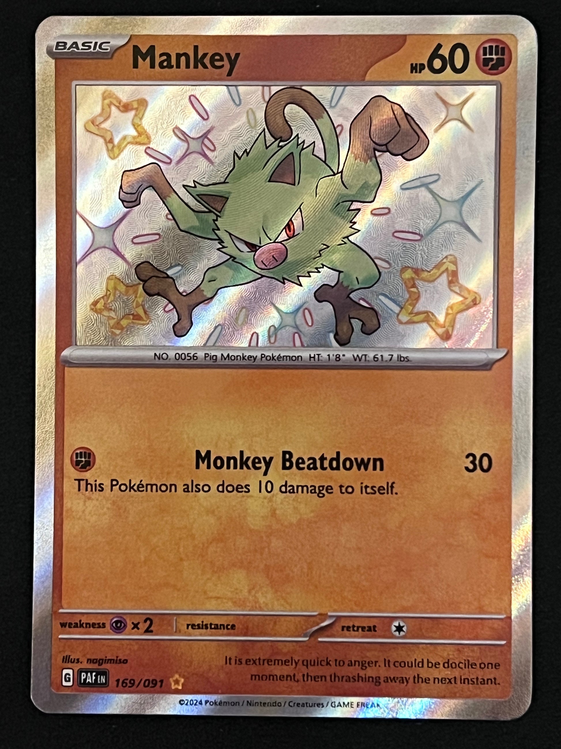 169/091 Mankey - Pokémon Paldean Fates Shiny Rare, mint/near-mint condition, comes packed in a sleeve and a semi-rigid case.