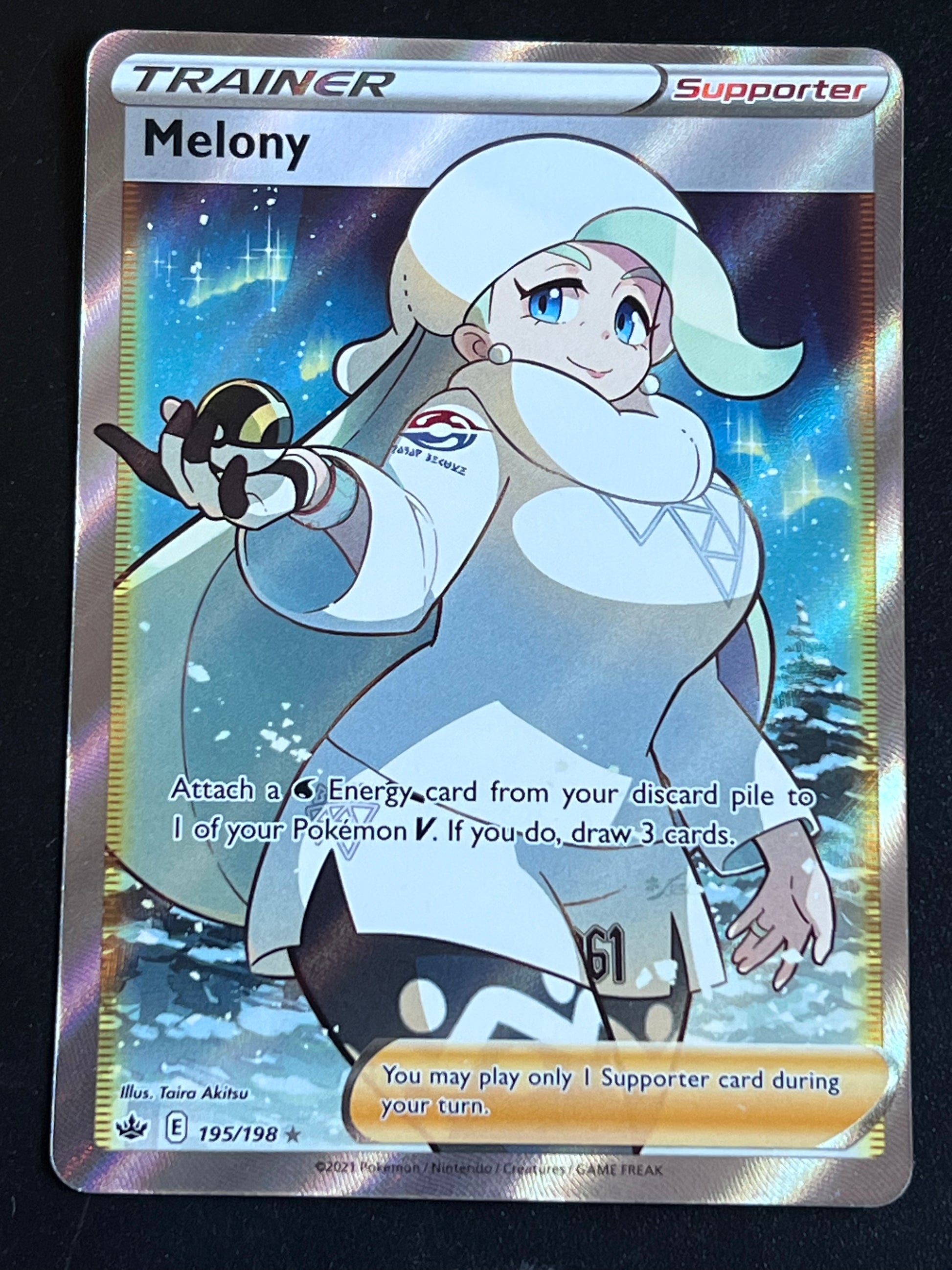 195/198 Melony - Pokémon Chilling Reign Full Art, near-mint/mint condition, comes packed in a sleeve and a semi-rigid case.