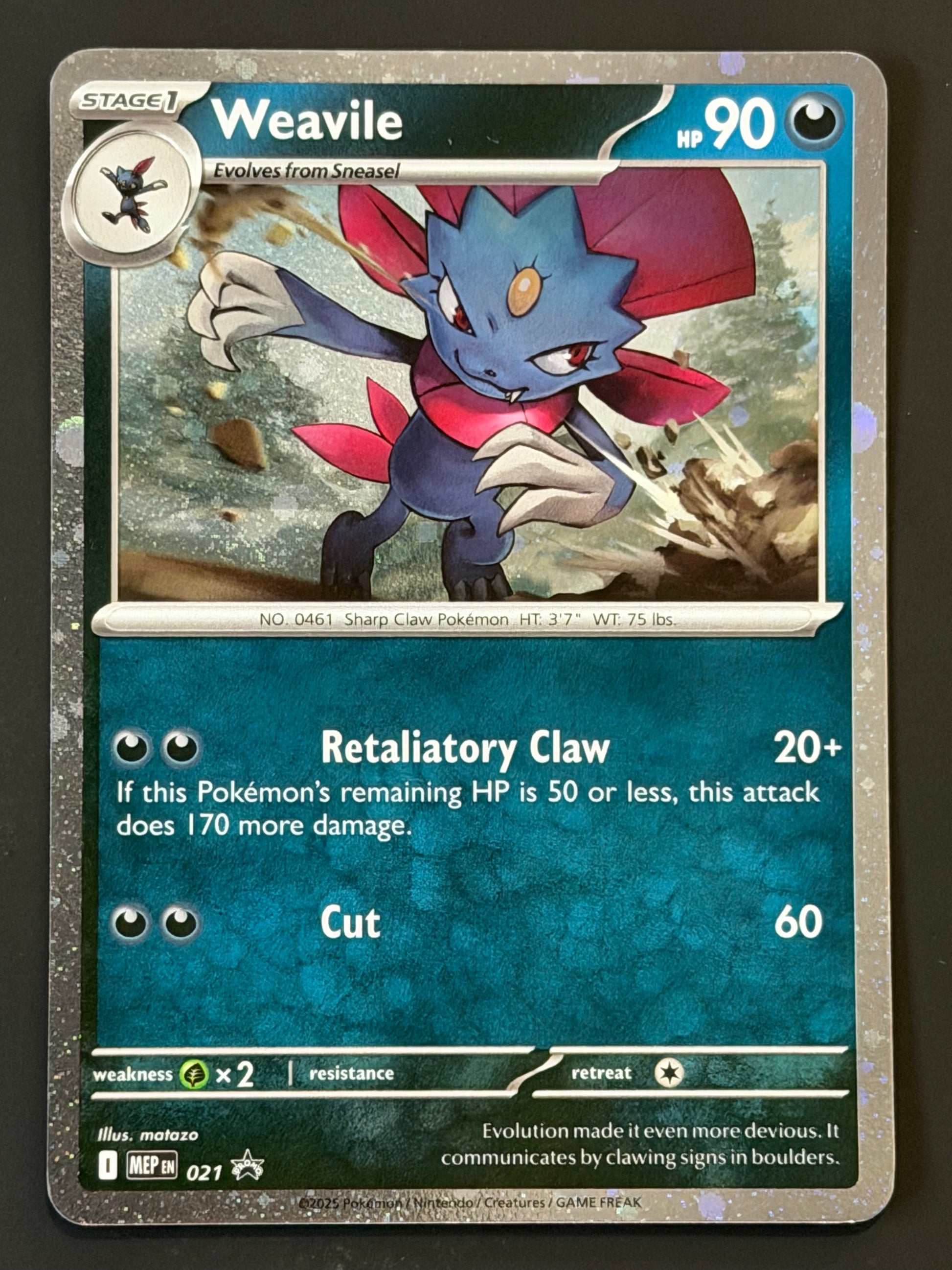 MEP021 Weavile - Pokémon Black Star Promo, near-mint condition, comes packed in a sleeve and a semi-rigid case.