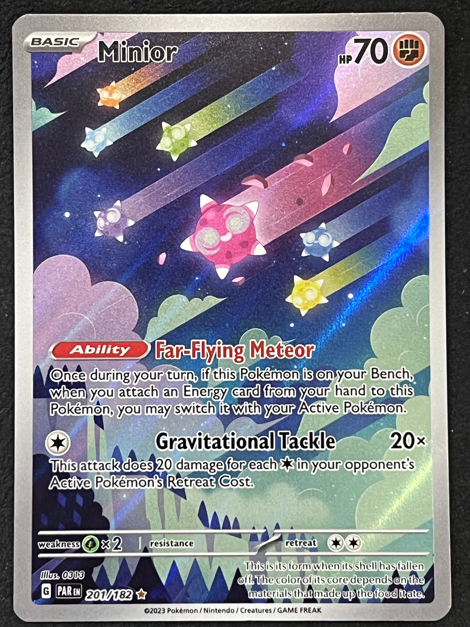 201/182 Minior - Pokémon Paradox Rift Illustration Rare, mint/near-mint condition, comes packed in a sleeve and a semi-rigid case.