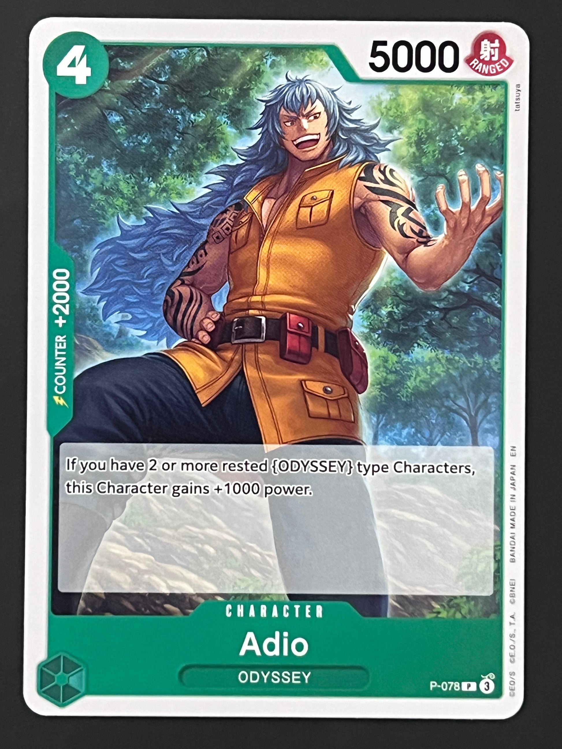 P-078 Adio - One Piece The Best Vol. 2 Promo, near-mint/mint condition, comes packed in a sleeve.