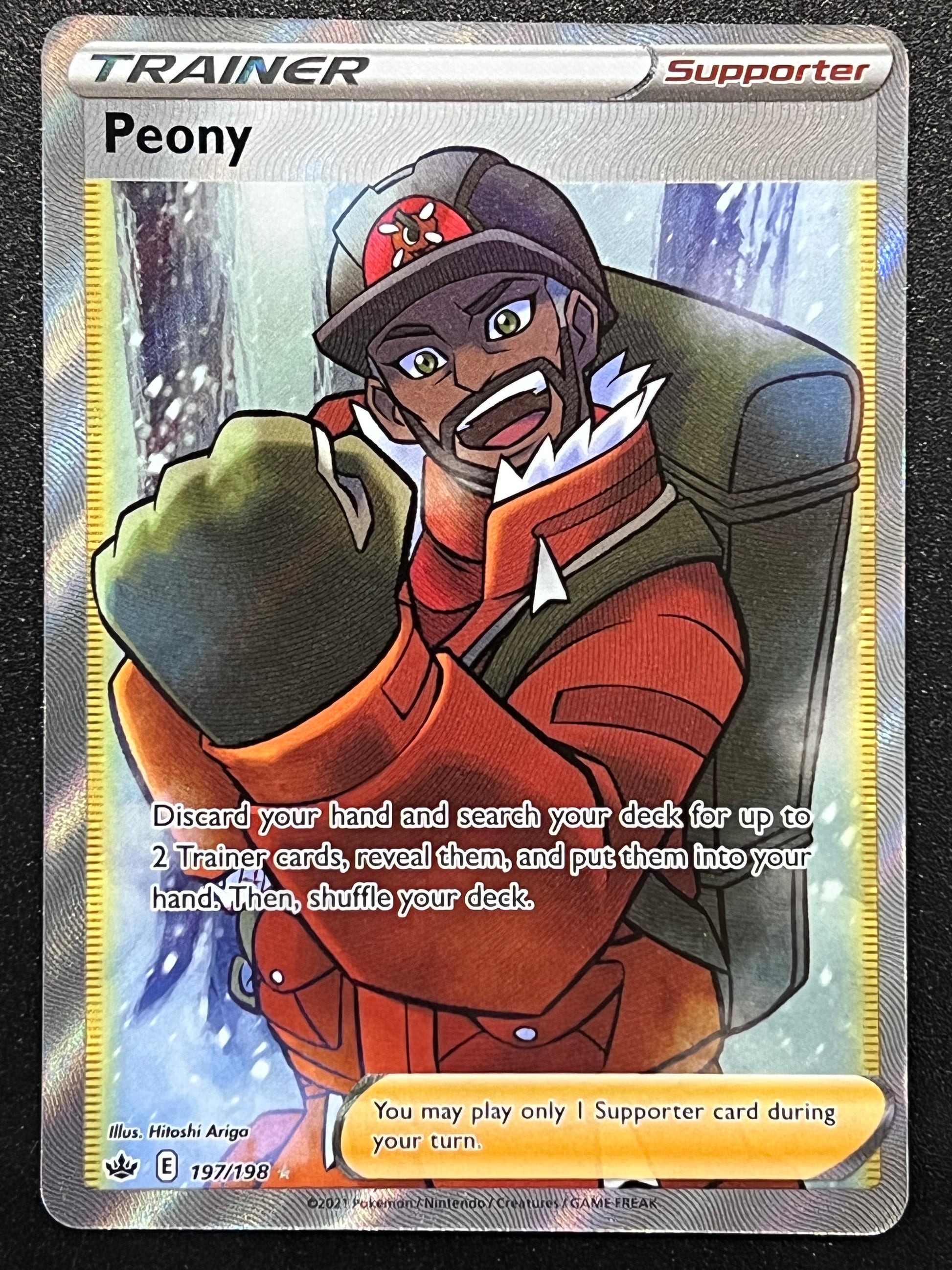197/198 Peony - Pokémon Chilling Reign Full Art, near-mint/mint condition, comes packed in a sleeve and a semi-rigid case.