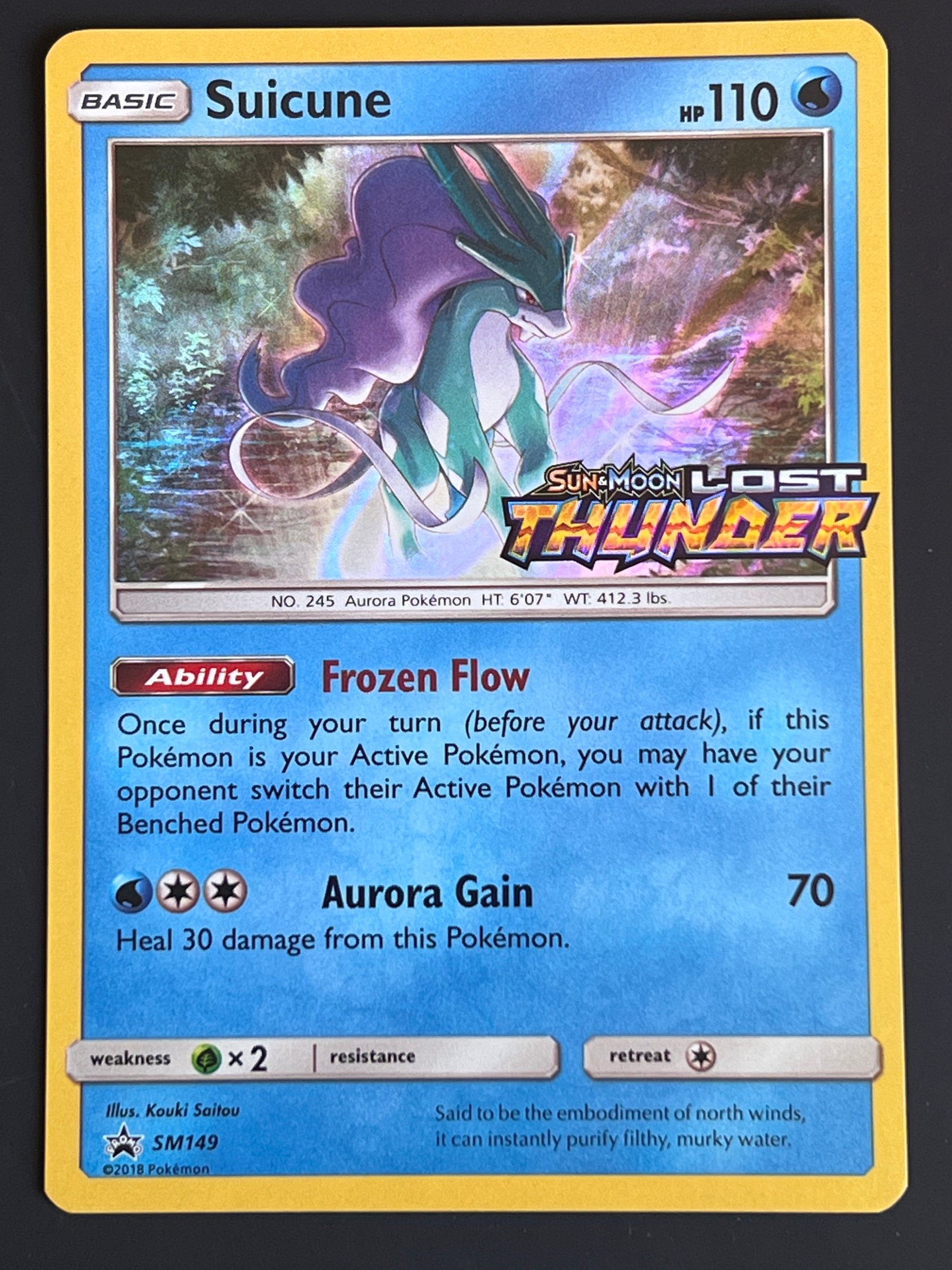 SM149 Suicune (STAMPED) - Pokémon Black Star Promo, near-mint condition, comes packed in a sleeve and a semi-rigid case.