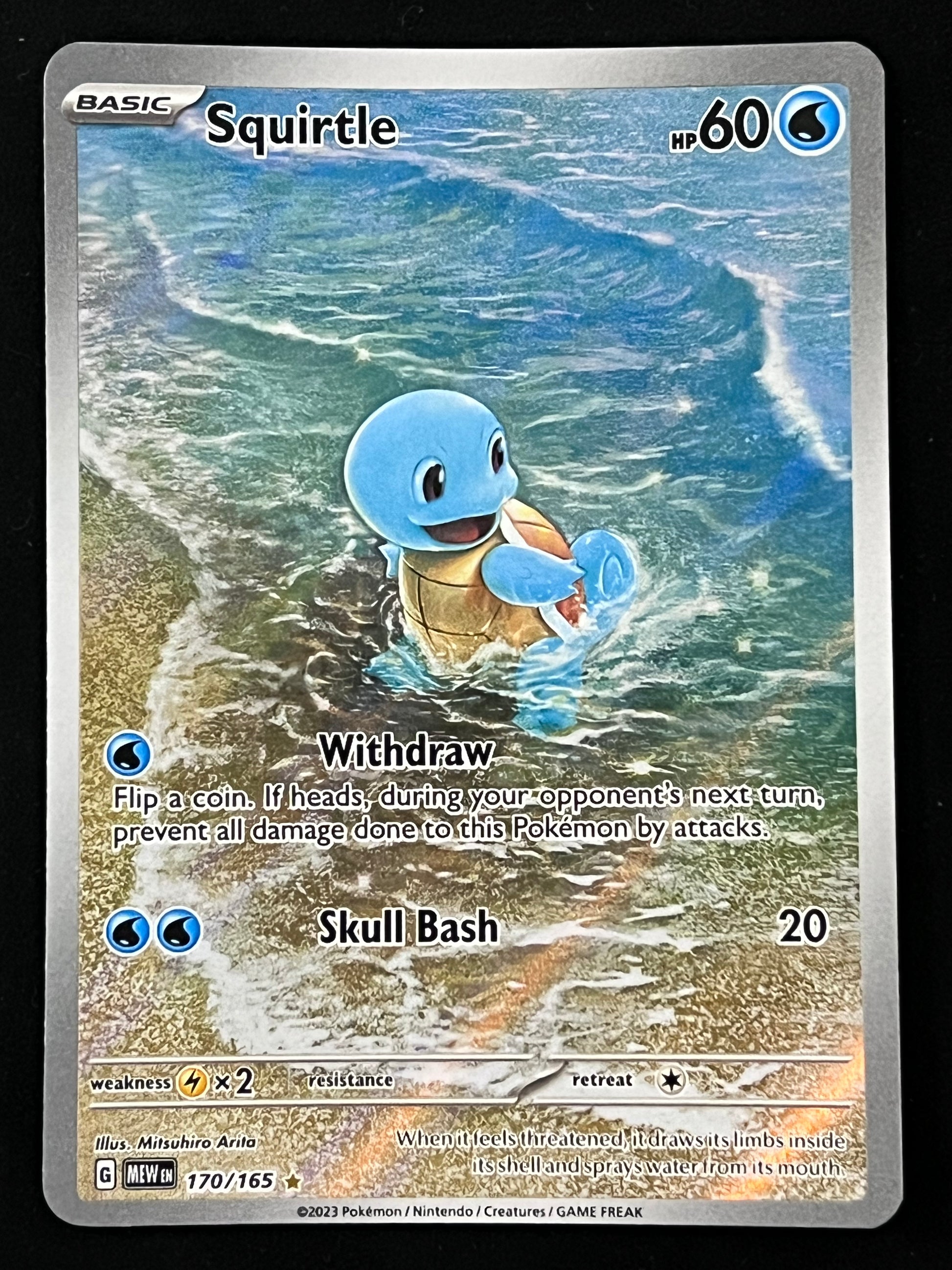 170/165 Squirtle - Pokémon 151 Illustration Rare, mint/near-mint condition, comes packed in a sleeve and a semi-rigid case.