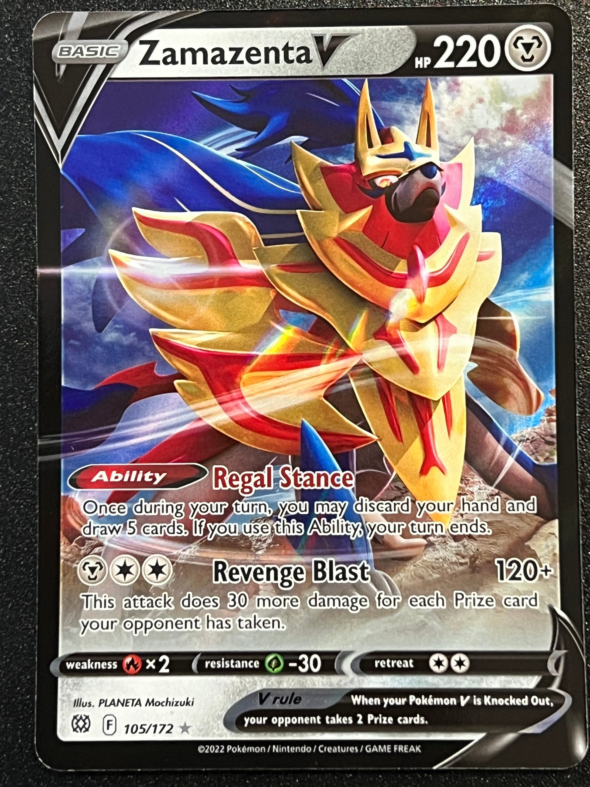 105/172 Zamazenta V - Pokémon Brilliant Stars Ultra Rare, mint/near-mint condition, comes packed in a sleeve and a semi-rigid case.